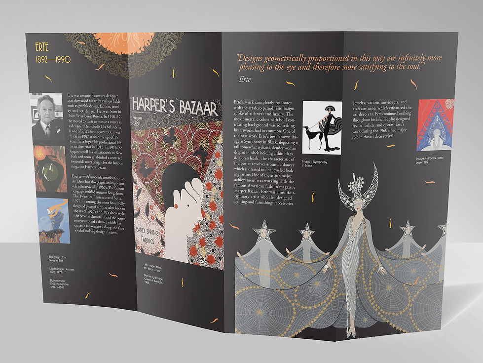 A museum exhibit celebrating the Art Deco movement through an overview poster and brochures highlighting three influential designers. The project offers a rich narrative of the era, blending historical insight with visual storytelling.